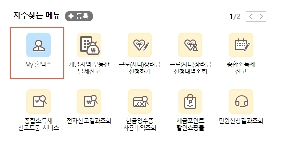홈택스 접속 후 우측 상단에 있는 로그인 버튼을 클릭한 후 본인 인증 공동인증서 로그인을 진행합니다. 로그인 후 자주 찾는메뉴에서 MY홈텍스 매뉴를 클릭하고 지급명세서 제출내역을 클릭합니다.
