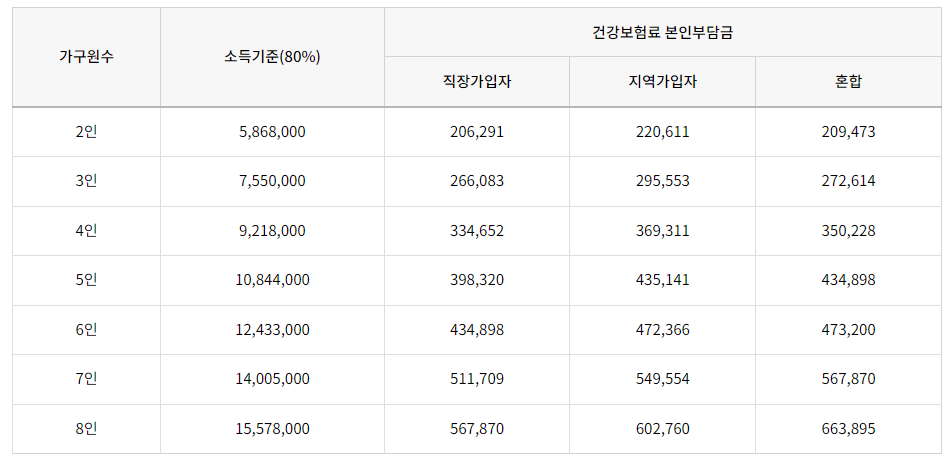 2022년 가구원수 및 가입유형별 기준 중위소득 180% 이하 판정 기준표는 아래 참고바라며 건강보험료 본인부담금은 노인장기요양보험료 미포함 금액입니다.