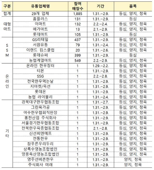 즈’ 2024년 설맞이 한우할인판매 행사 안내 2024년 설날을 맞이하여 한우할인판매행사를 1월31일(수)부터 2월9일(금)까지 10일간 대형마트 및 영농조합법인 및 온라인 등으로 한우할인판매행사를